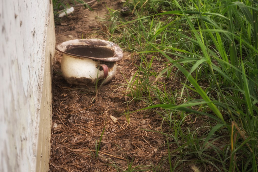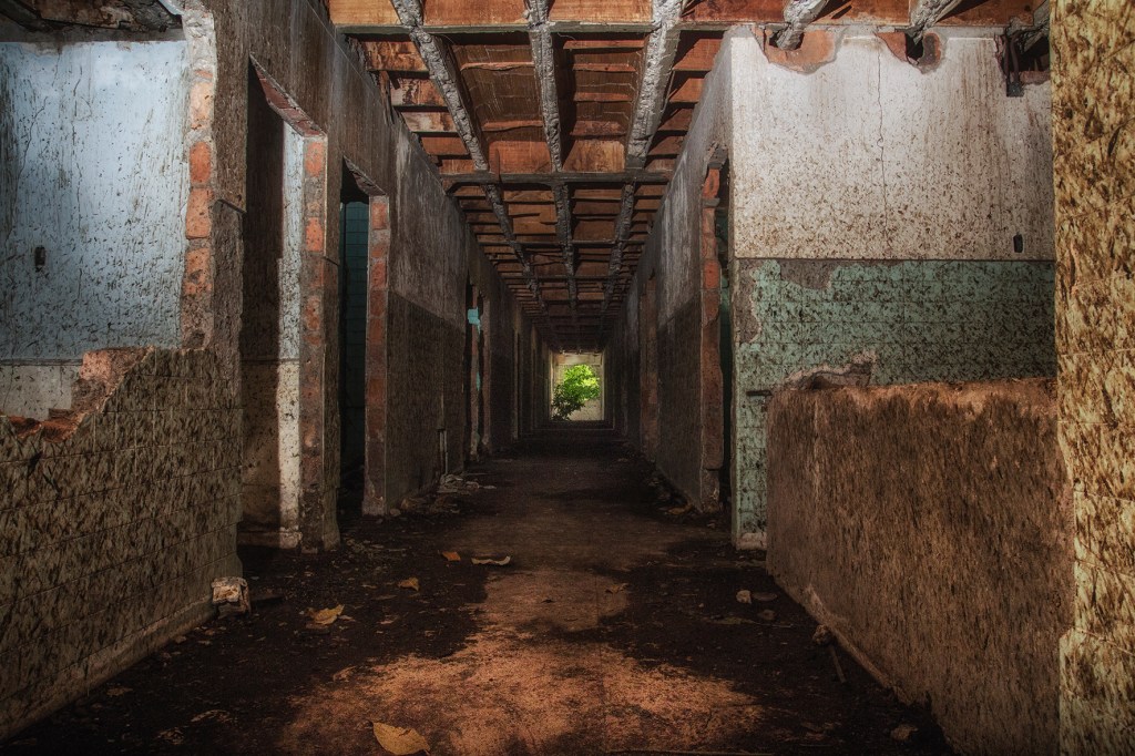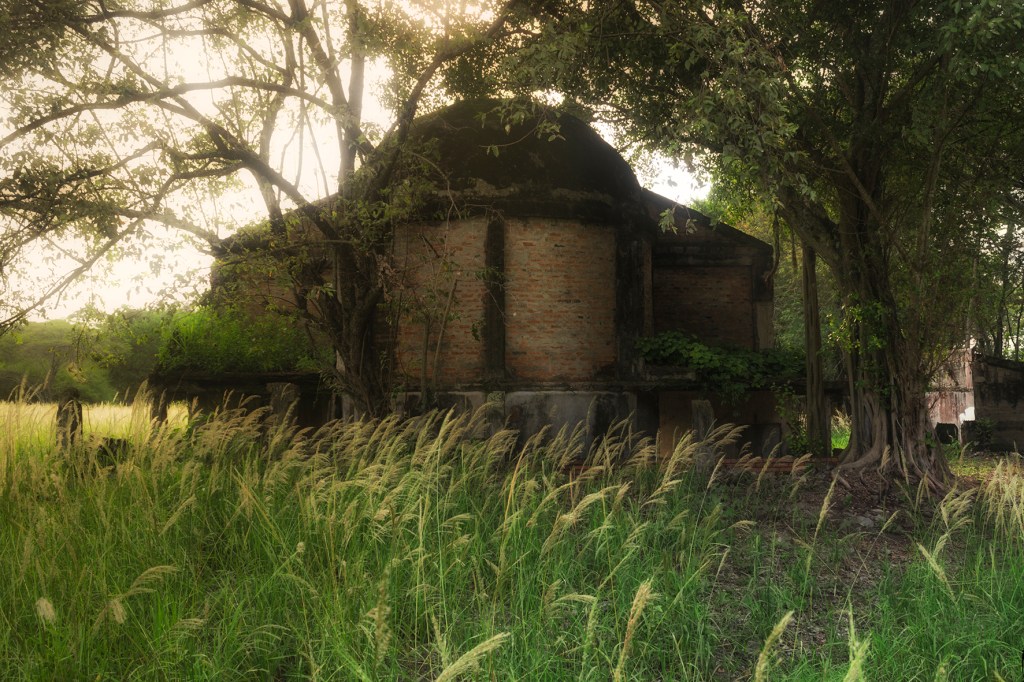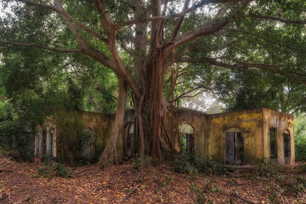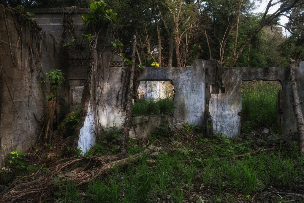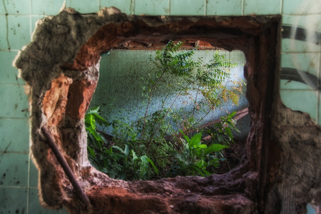 Así las fotografías evidencian el diálogo de un espacio en ruina con la naturaleza, donde las casas entre raíces y manchas ahora están llenas de árboles; el hospital, lugar de nacimiento y muerte, ahora en penumbra es la madriguera de un murciélago; la iglesia parece en su forma cóncava reverberar el sonido de cantos religiosos formados por los pastizales que son movidos por los vientos, por último los objetos abandonados están llenos de naturaleza y presencia.