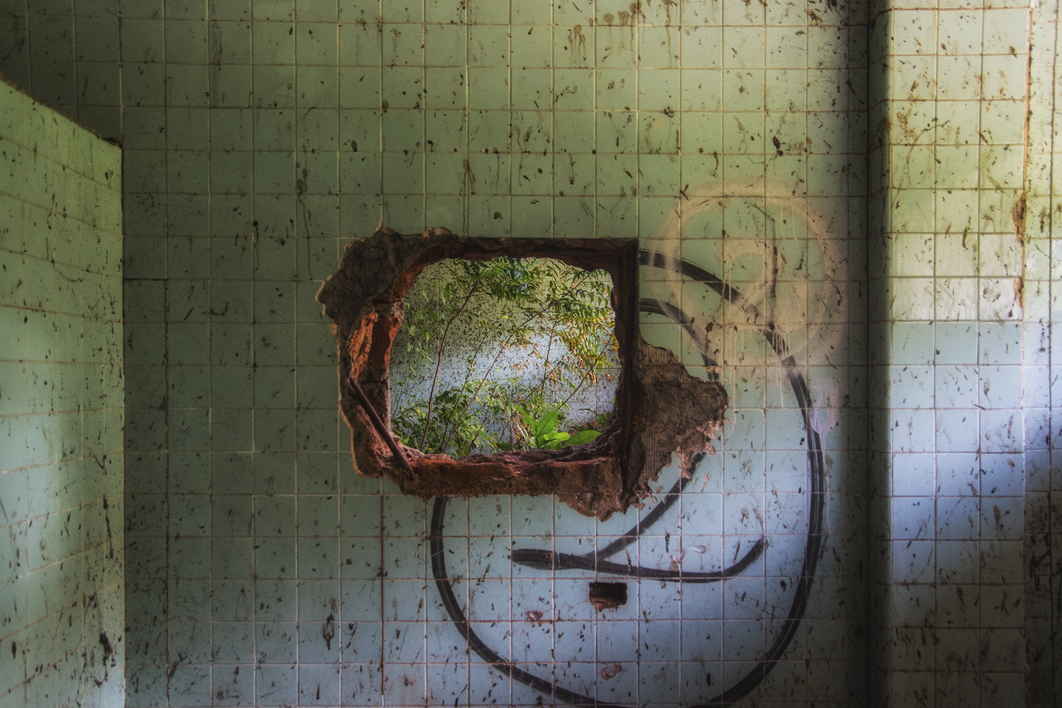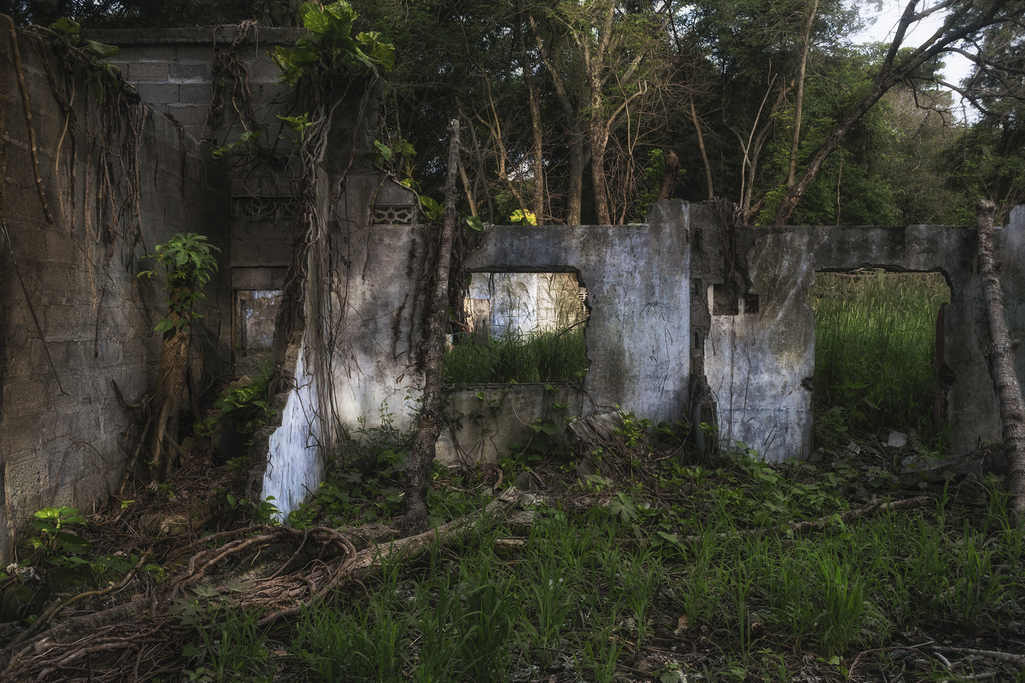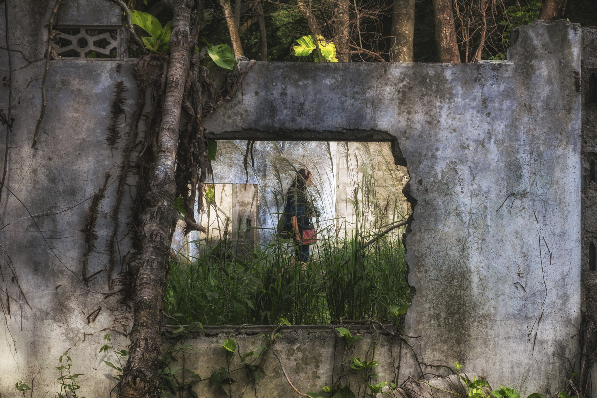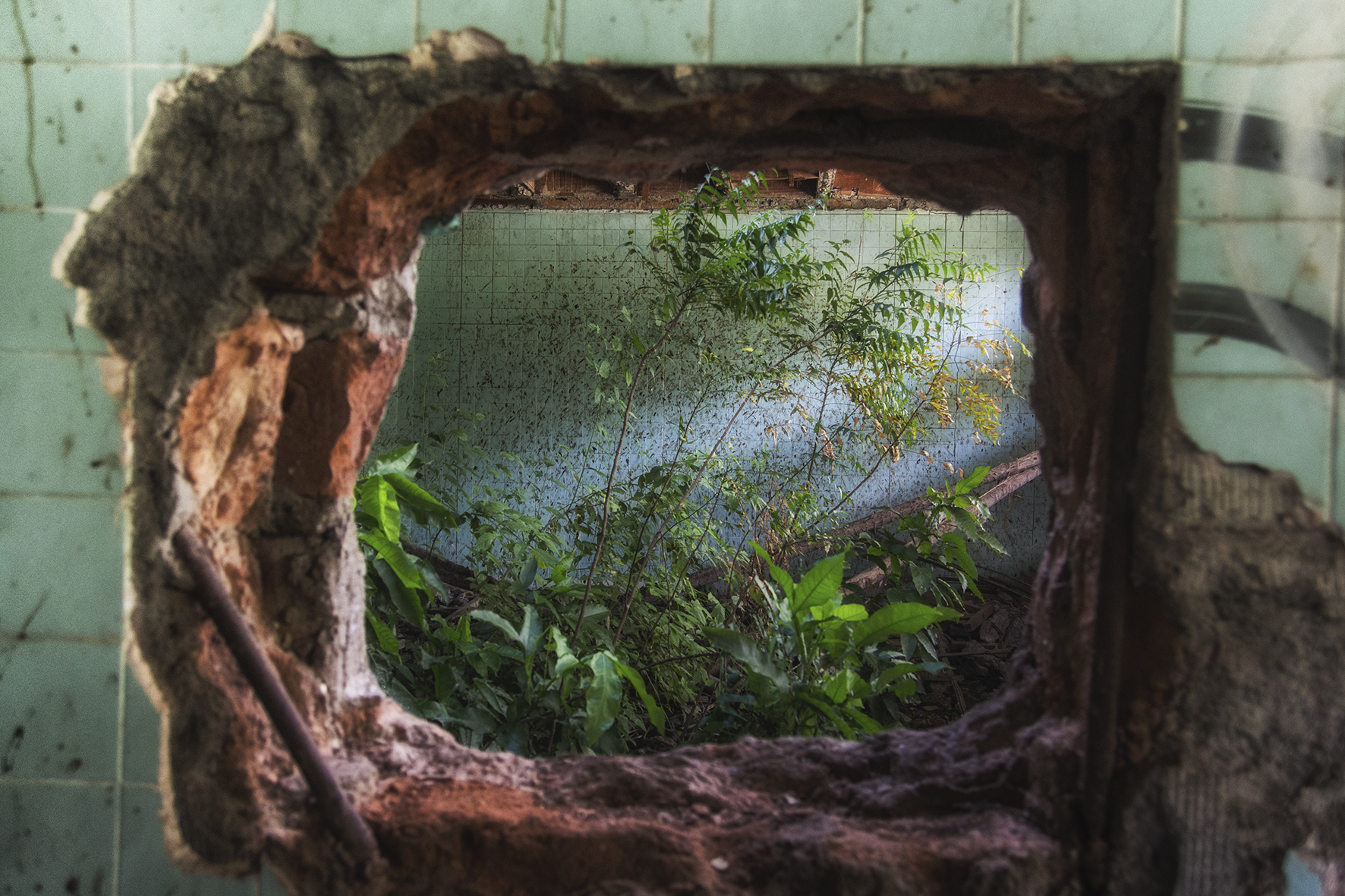 Así las fotografías evidencian el diálogo de un espacio en ruina con la naturaleza, donde las casas entre raíces y manchas ahora están llenas de árboles; el hospital, lugar de nacimiento y muerte, ahora en penumbra es la madriguera de un murciélago; la iglesia parece en su forma cóncava reverberar el sonido de cantos religiosos formados por los pastizales que son movidos por los vientos, por último los objetos abandonados están llenos de naturaleza y presencia.