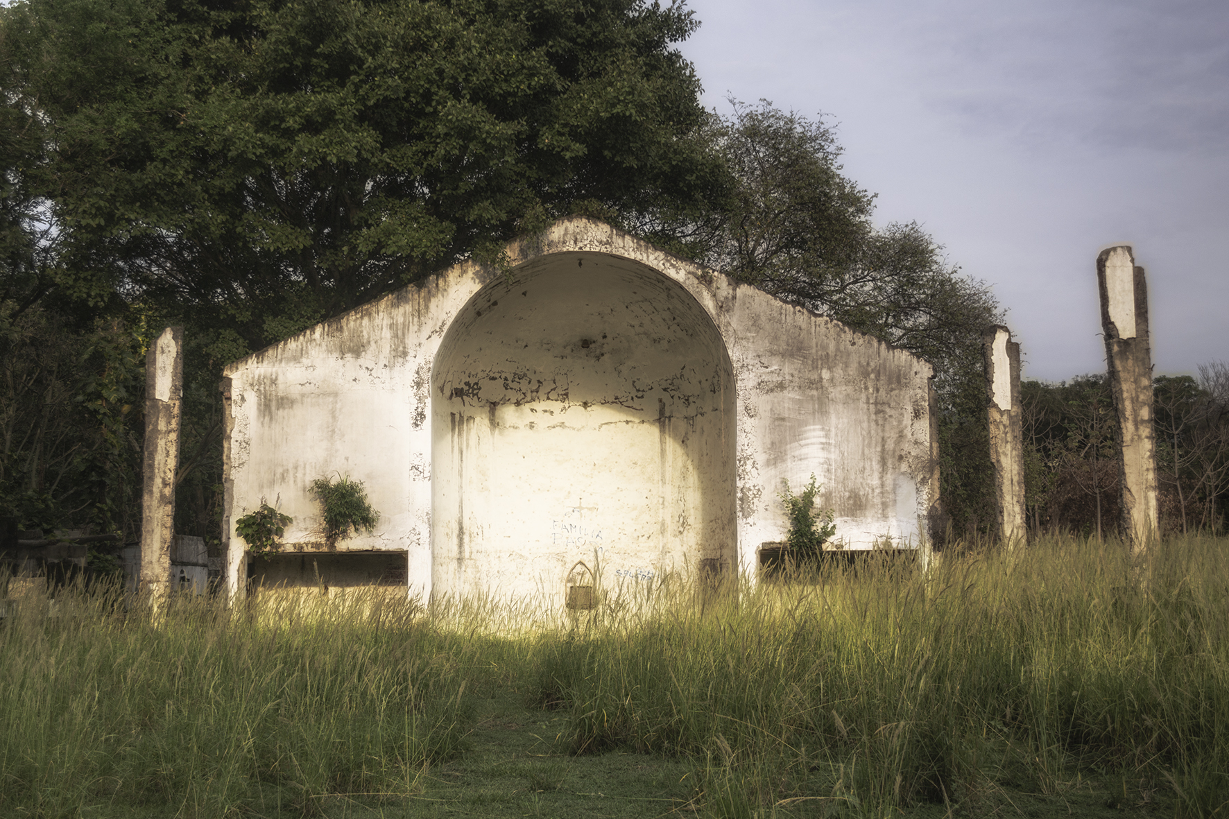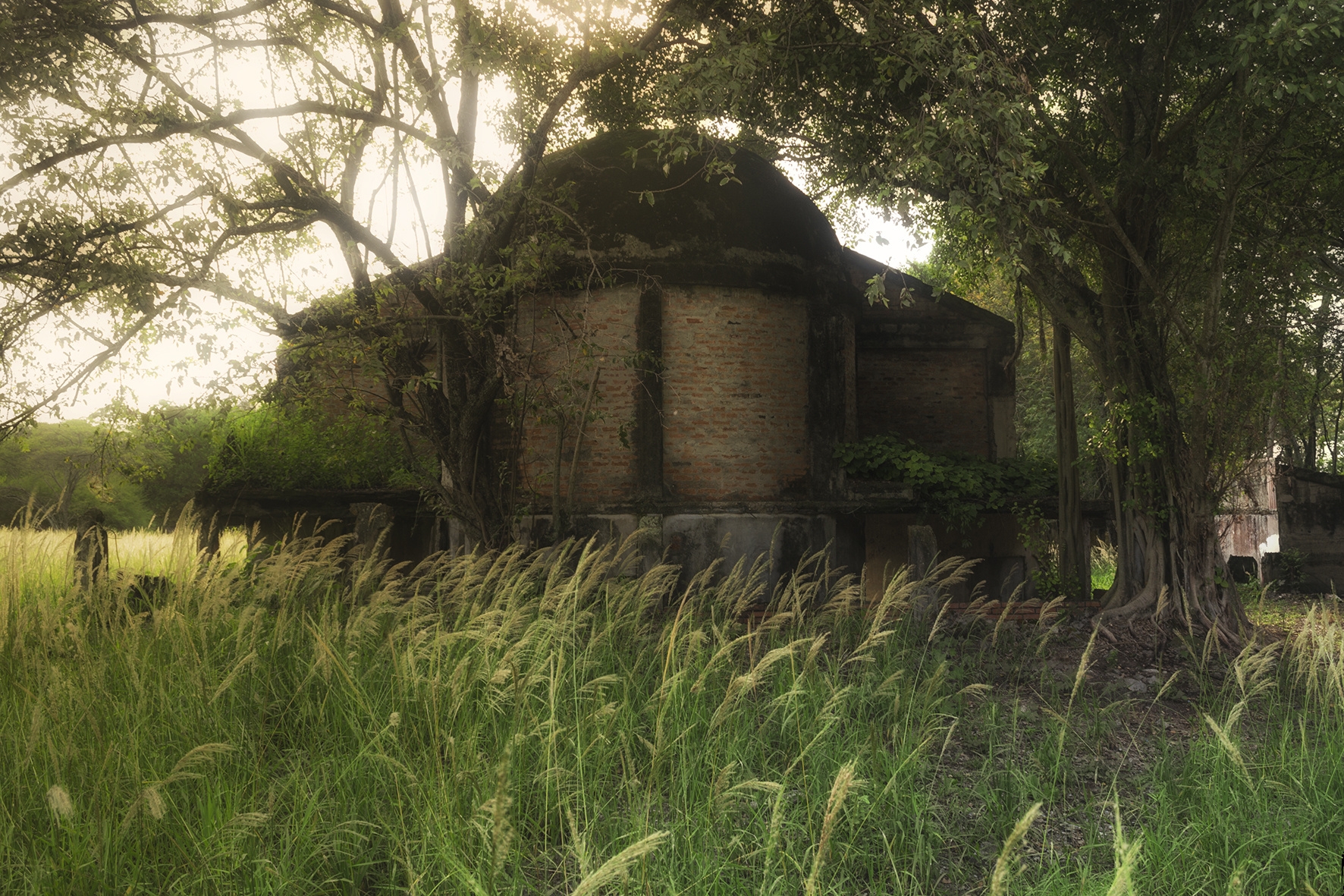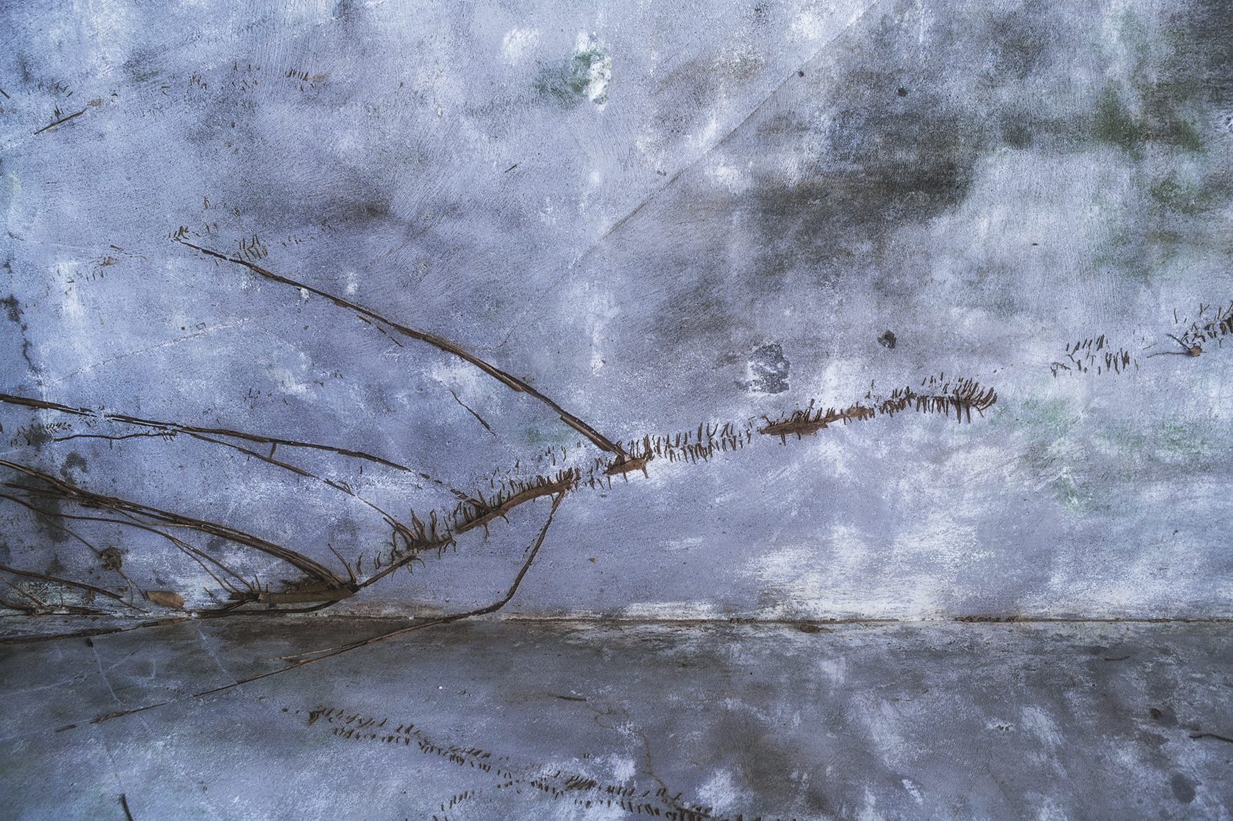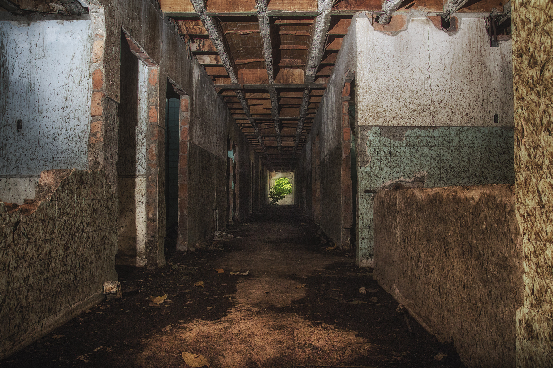 Así las fotografías evidencian el diálogo de un espacio en ruina con la naturaleza, donde las casas entre raíces y manchas ahora están llenas de árboles; el hospital, lugar de nacimiento y muerte, ahora en penumbra es la madriguera de un murciélago; la iglesia parece en su forma cóncava reverberar el sonido de cantos religiosos formados por los pastizales que son movidos por los vientos, por último los objetos abandonados están llenos de naturaleza y presencia.
