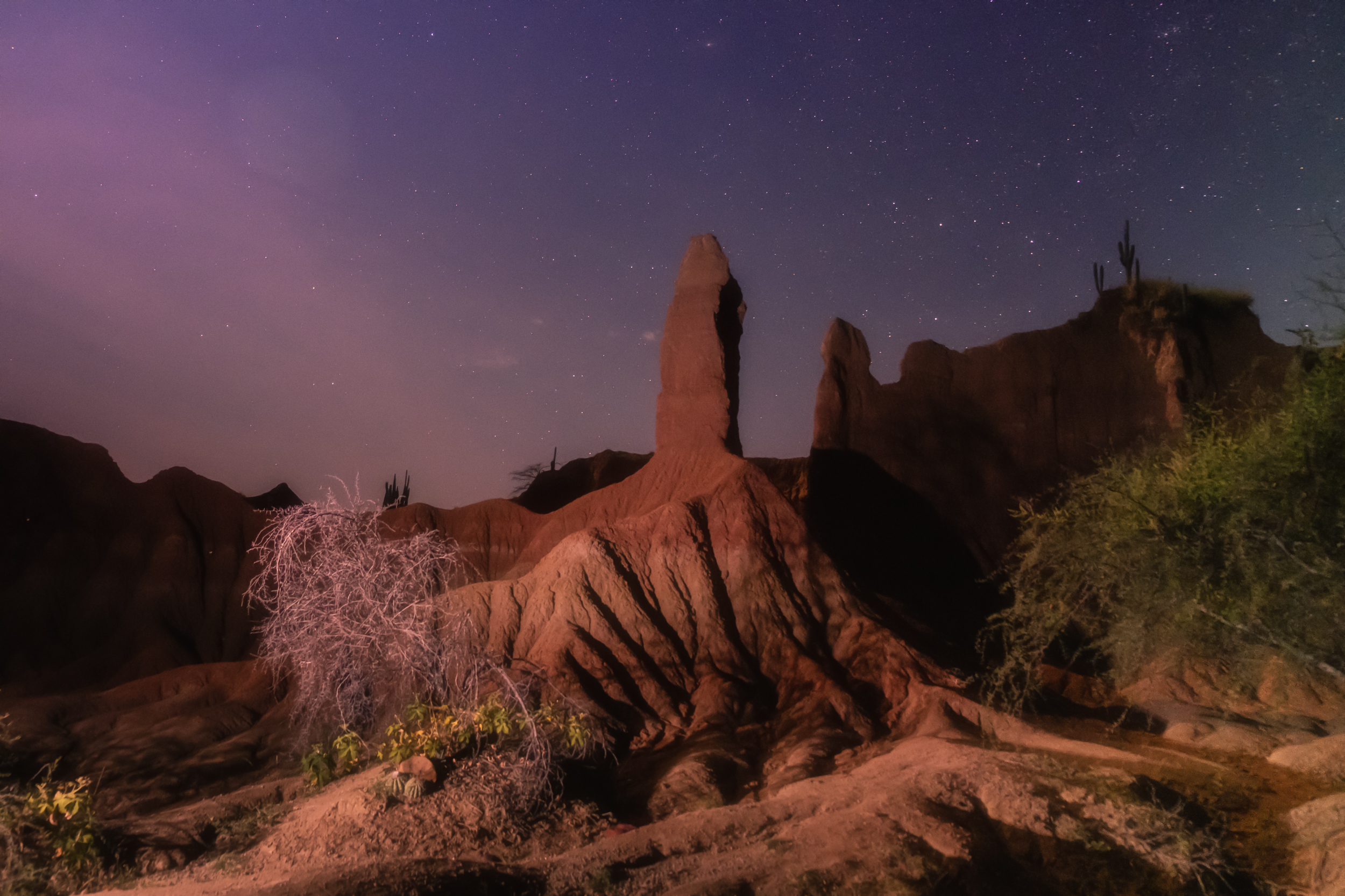 El paisaje del Desierto de la Tatacoa en Huila, ofreció una noche solitaria, donde la oscuridad permite entrever el paisaje de la segunda zona más árida en Colombia en conjunto con las estrellas.