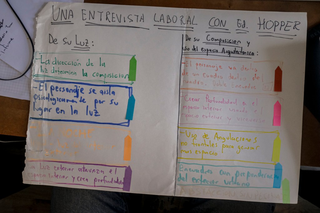 G.S.: Pues ahí sí me gustaría mostrarte cosas. Entonces, la primera lectura consistió en pensar a partir de lo que me estaba proponiendo, cómo crear esa visión a través de la ventana. Entonces, evidentemente, el pintor de las ventanas y de las escenas urbanas que se me vino a la cabeza fue Edward Hopper. Me puse a estudiar la obra de Hopper.