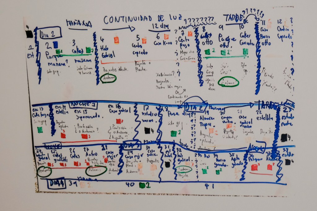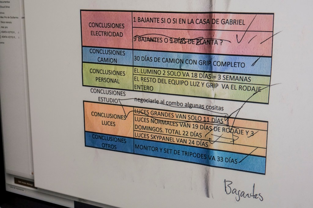 Este fue el plan de rodaje dependiendo de las cosas que vamos a usar, cuándo íbamos a usarlas, organizarlo y dependiendo también de una transición de la luz en la película. O sea, si la película se va a narrar de cierta manera, cómo iban esos modos. Había ciertas escenas en donde sabíamos que no íbamos a usar un carajo de iluminación, y eso permite bajar los costos de los alquileres y comprimir todo lo de iluminación en una continuidad de rodaje. Para tener una coherencia con la continuidad de la narración de la película.