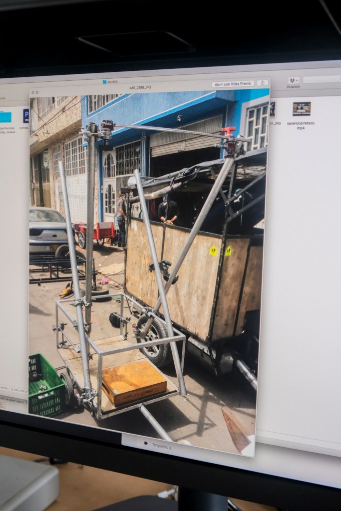 G.S.: Entonces aquí están las pruebas (Fig.16). Esto fue, este es el carrito que construimos para llevar la cámara, que estaba jalado por el otro carrito. Ahí se ve la carreta allá y el carrito ahí. Y yo iba en ese carrito con el estabilizador.