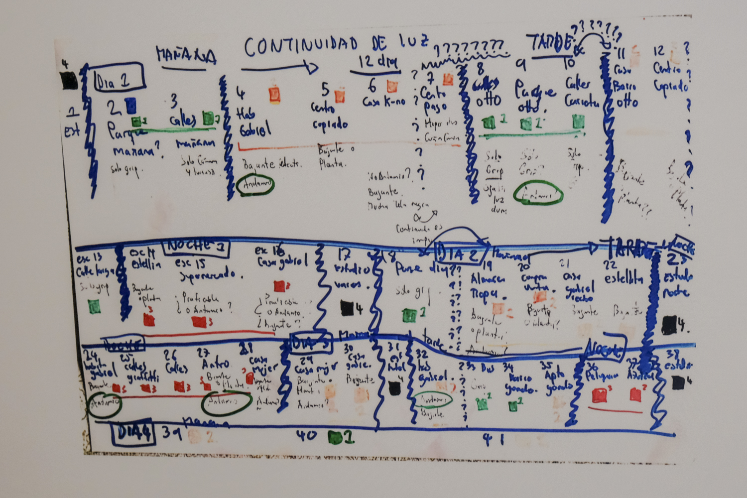 G.S.:Sí, todo estaba súper pensado. Lo primero era el trabajo sobre papel, con el guión, de coger cada escena y hacer este estudio. Y ahí comenzar a aplicarlo. Yo tenía todo impreso en el guión, con los papelitos.