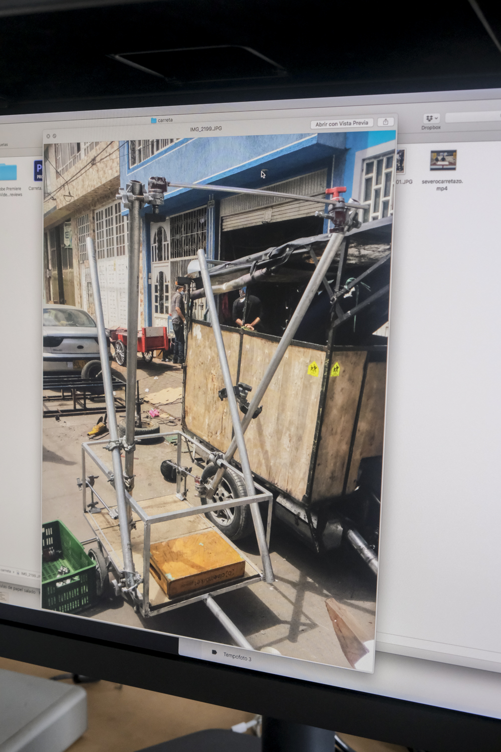 G.S.: Entonces aquí están las pruebas (Fig.16). Esto fue, este es el carrito que construimos para llevar la cámara, que estaba jalado por el otro carrito. Ahí se ve la carreta allá y el carrito ahí. Y yo iba en ese carrito con el estabilizador.